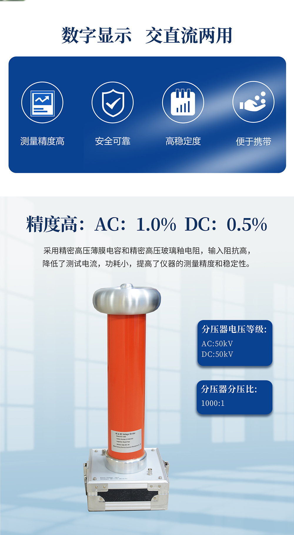 用于電力系統及電氣電子設備制造部門測量工頻交流高電壓和直流高電壓。參考標準:DL/T 846.1-2016