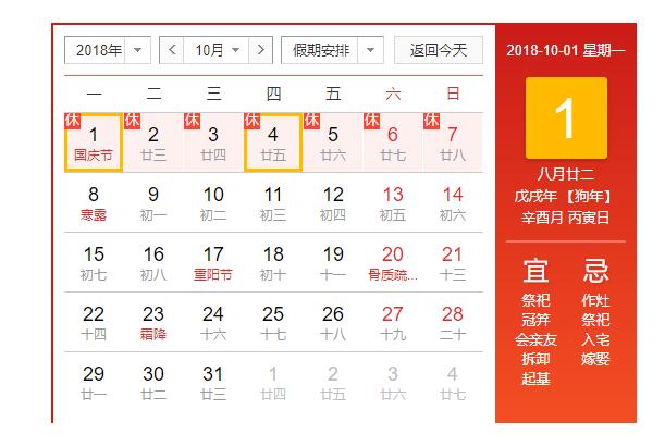一、國慶節(jié)放假時(shí)間為:2018年10月1日(周一)至2018年10月7日(周日),放假共7天假期,2018年10月8號(hào)(周一)正常上班。2018年9月29日(星周六)、9月30日(周日)為正常上班。
