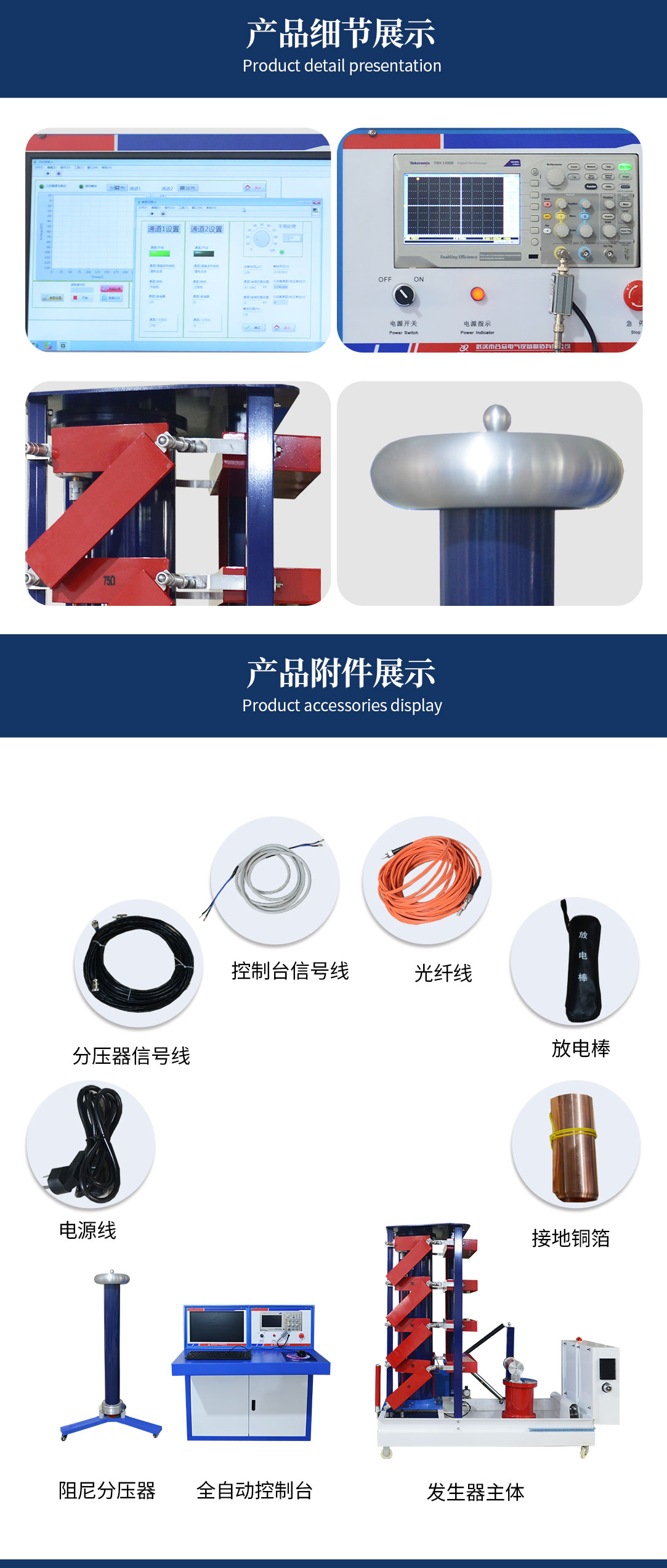 波頭時間:1.2±30%μs,波尾時間:50±20%μs,過沖:小于5%,效率:不低于90%?!?.2/50μs標準雷電沖擊電壓全波,效率大于90%。