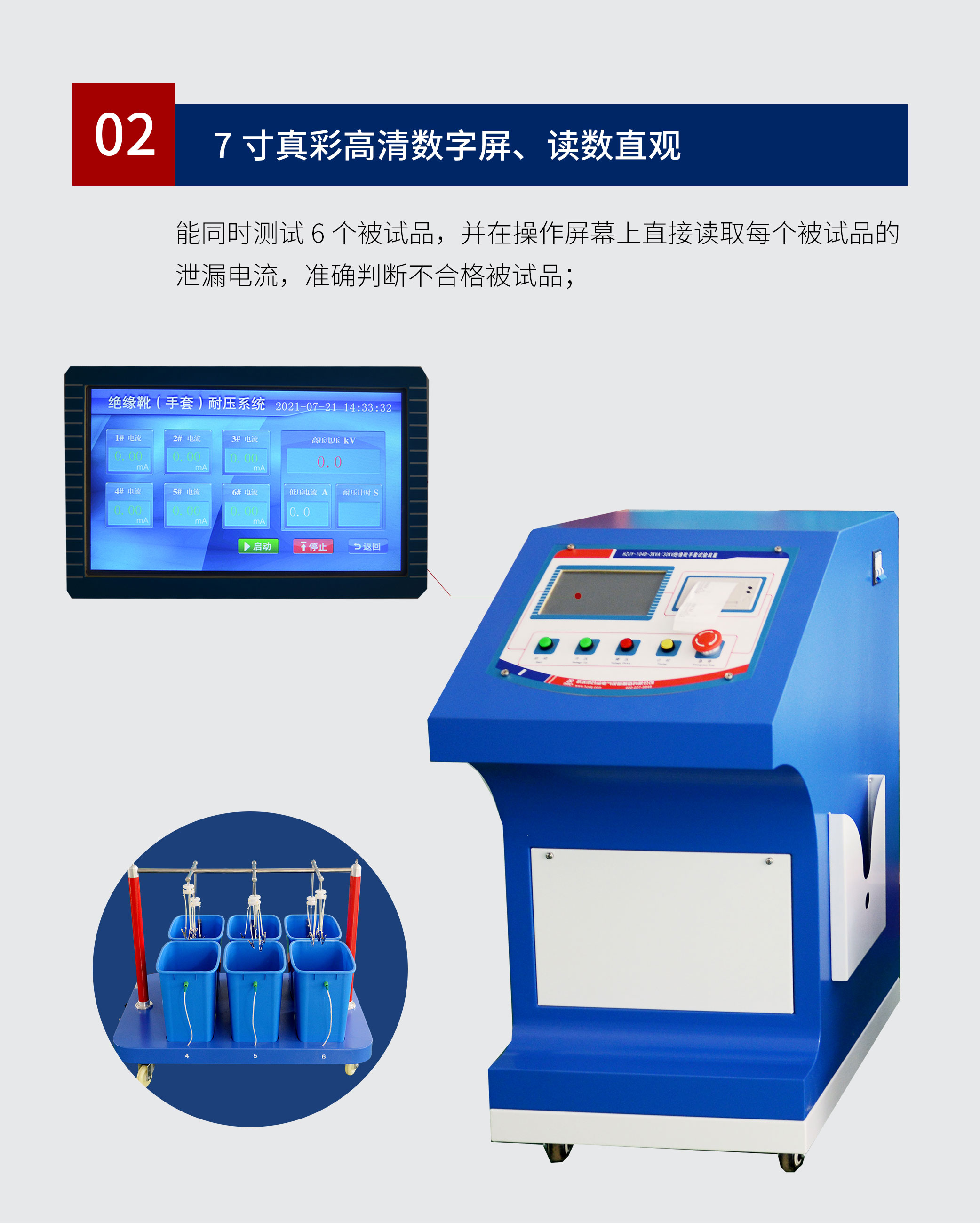 全自動絕緣靴(手套)耐壓試驗裝置是我公司根據絕緣靴(手套)試驗規程,并遵從廣大用戶意見而設計生產的,是絕緣靴(手套)批量試驗的專用設備。也可以對安全工器具進行測試,例如絕緣桿、絕緣螺絲刀、絕緣墊等。絕緣靴手套耐壓試驗裝置采用全自動升(降)壓,自動讀出每個被試品的泄漏電流,整個試驗過程自動完成,無需人工干預,有效的解決了過去不規則的測試方式,從而簡化了測試手續,提高了測試速度。更可靠地鑒別絕緣靴(手套)的泄漏電流,工頻耐壓等參數,保障試驗工作者的安全,是理想的絕緣靴(手套)專用設備。能同時測試6個被試品,并讀取每個被試品的泄漏電流,準確判斷不合格被試品;試驗車底部裝配腳輪,便于移動,采用7寸真彩高清數字屏,電阻式觸摸更精準,操作方便,擁有良好的交互體驗。執行標準:GB/T 17622-2008,GB 12011-2009,DL/T 976-2017