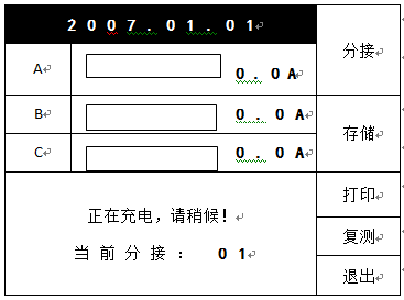 選擇好測(cè)量電流,接好三相接線,在初始界面狀態(tài)下按“測(cè)量”鍵后,直阻儀進(jìn)入測(cè)量狀態(tài),開始給繞組供電。并進(jìn)入如下界面: