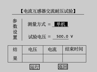試驗電壓:指本次試驗交流輸出保持電壓。“單機”時,儀器默認電壓值為500V,內置升壓器電壓范圍為(0~1000)V,在AC220V電源輸入情況下最高輸出電壓為600V,在AC380V電源輸入情況下最高輸出電壓1000V。互感器綜合特性測試儀選用“升壓器”時,儀器默認電壓值為1500V,外接升壓器電壓范圍為(0~2500)V。