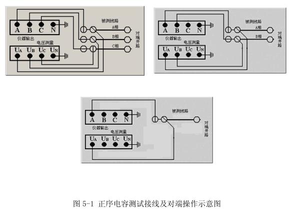 在正序電容(正序開路)測試中,被測線路對端(相對于測量端)開路,將儀器電源輸出引至被測線路測量端外側電流引下線,電壓測量輸入端接至電壓引下線,三相、兩相、單相回路的測試接線如圖5-1所示。