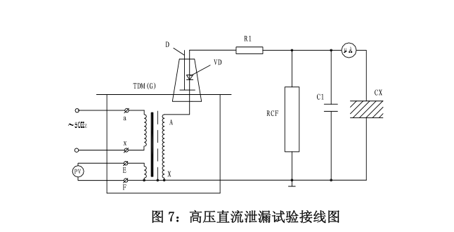 試驗變壓器在做被試品的直流耐壓或泄漏試驗時接線原圖如圖7。